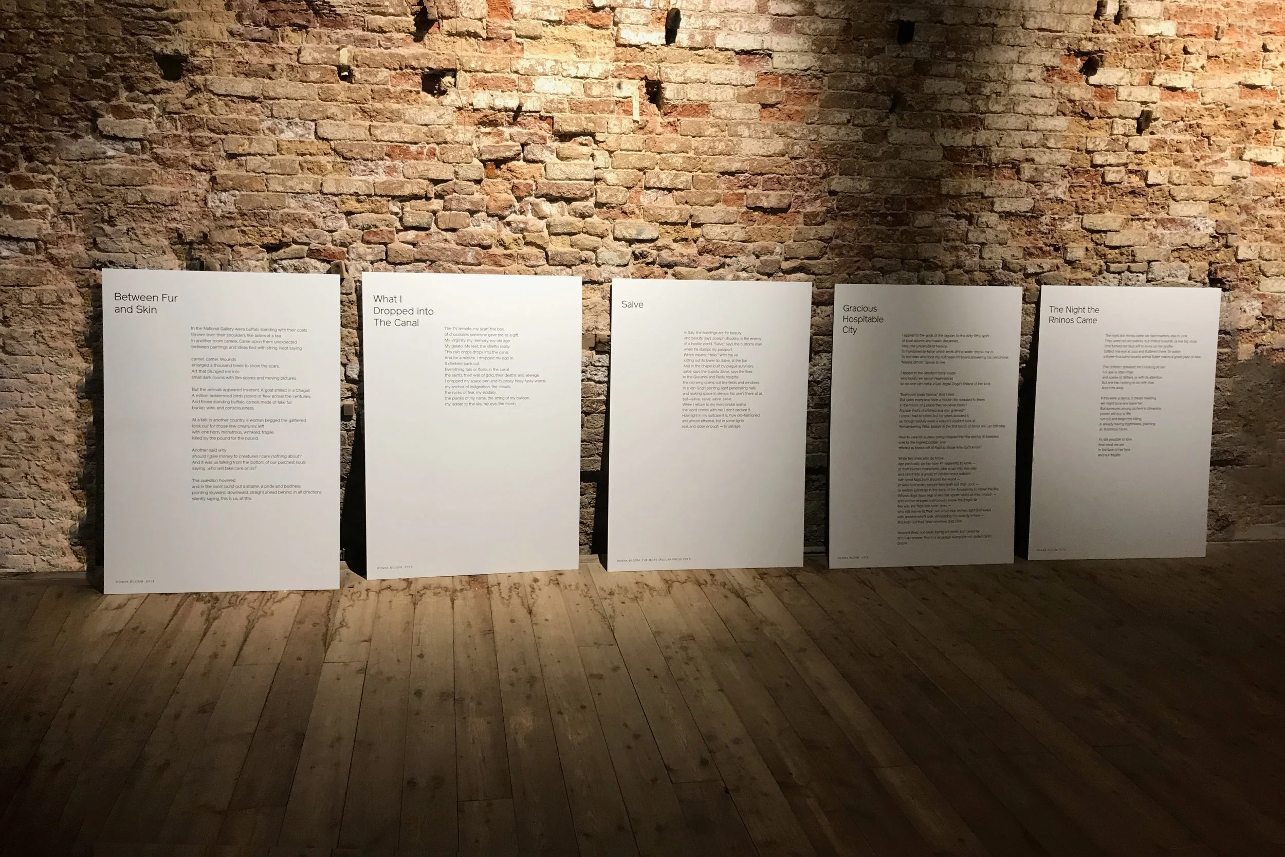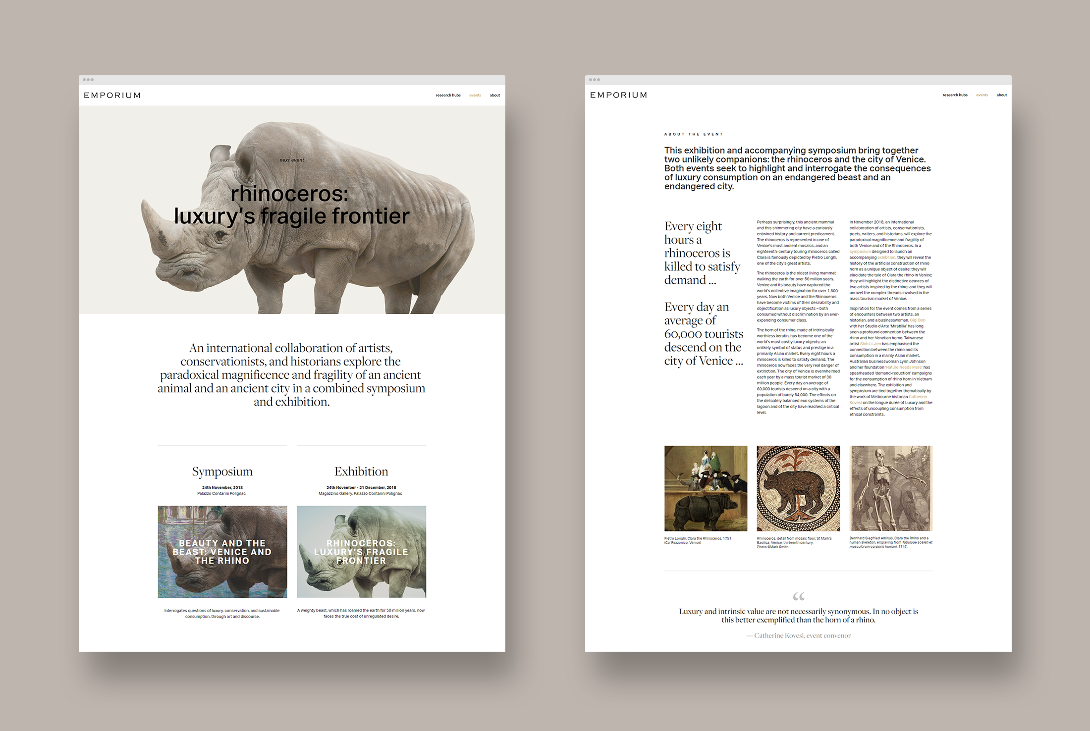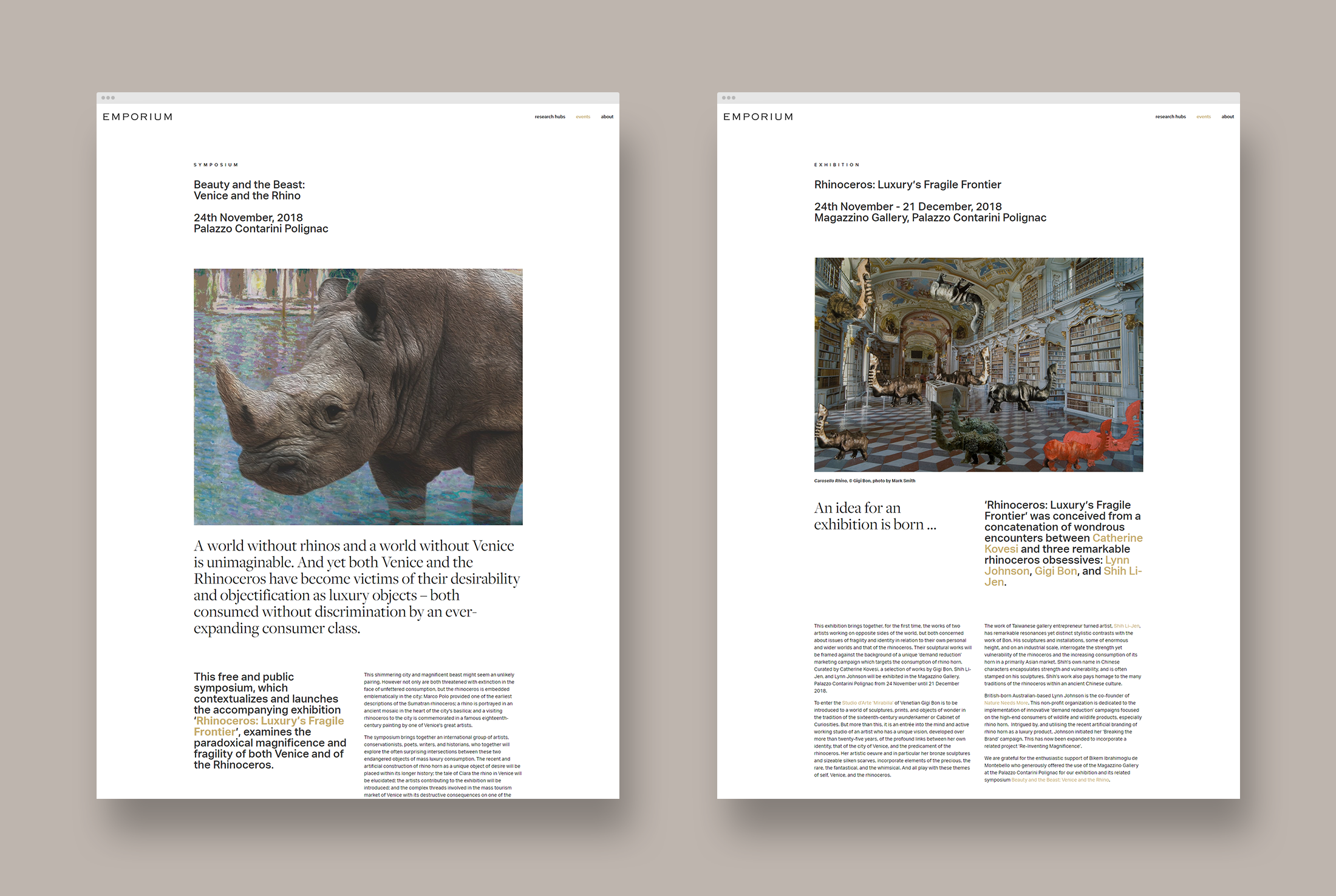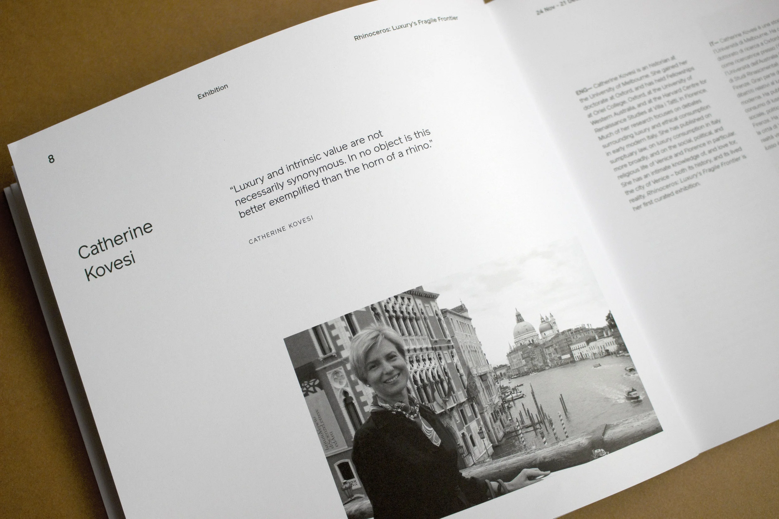 Branded materials included a 100 page exhibition catalogue transcribed in three languages (English, Italian and Traditional Chinese), sitting side-by-side, rather than singular language books; an event program available on the website and as hardcopy during the month of the exhibition; A0 posters of poems by the poet Ronna Bloom; directional totem signage; rhinoceros illustration for the catalogue; along with eDMs and eventbrite material.