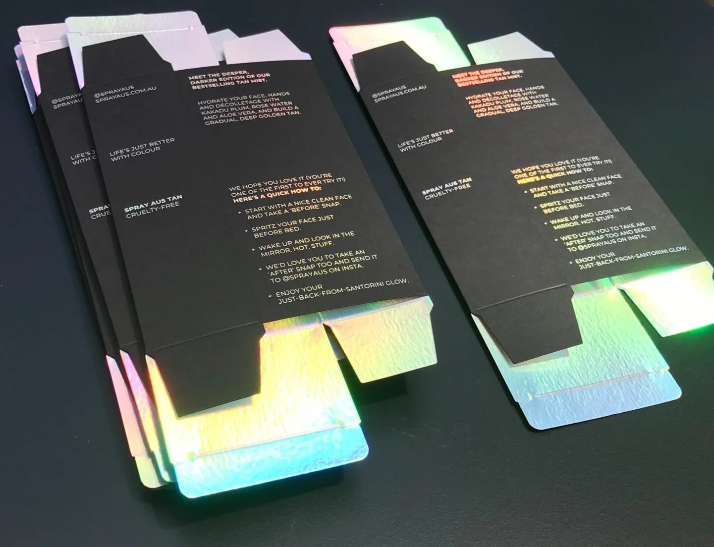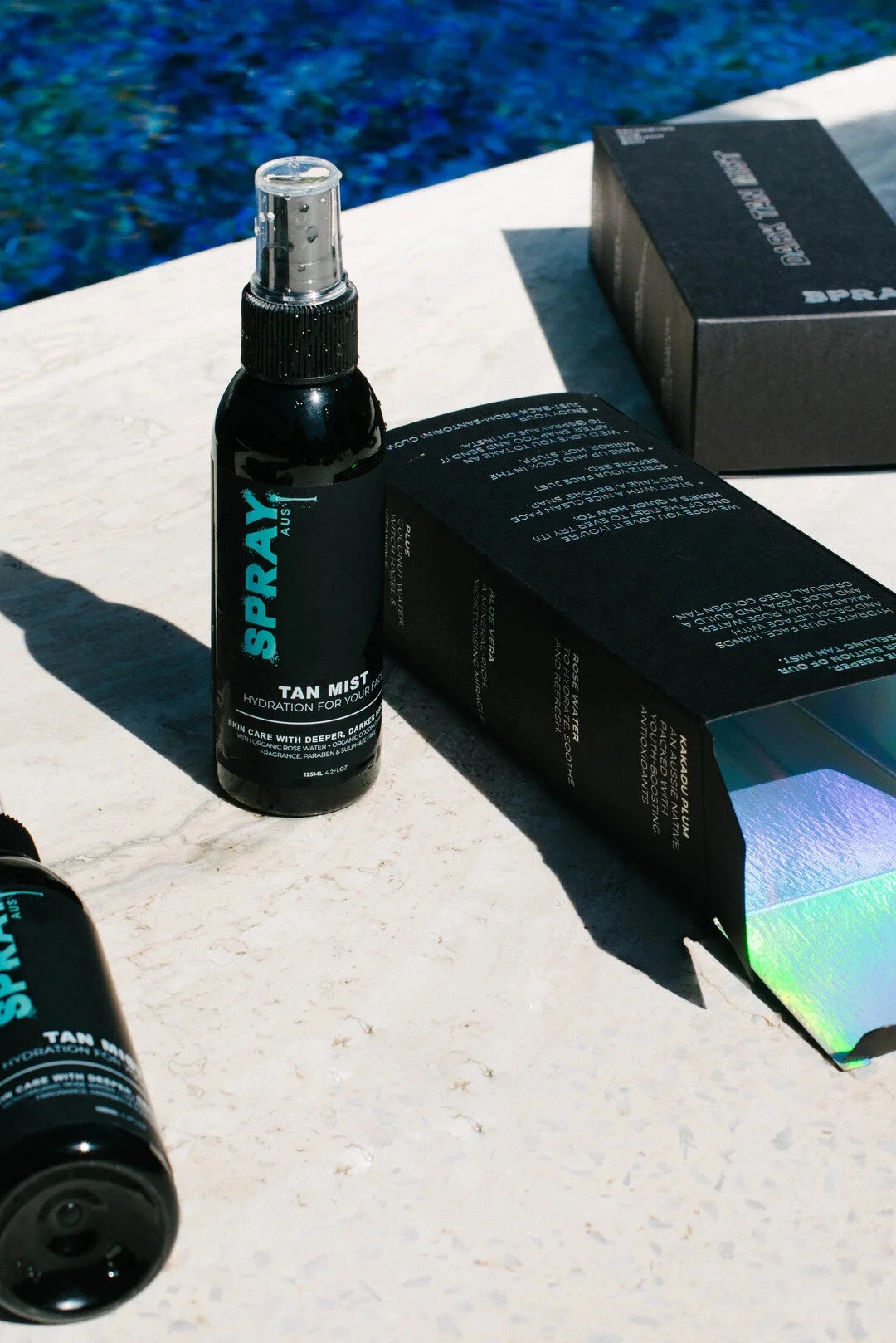 Holographic foil and black textured substrate brings the DARK TAN MIST to the fore and accents the black DARK TAN MIST bottle perfectly.